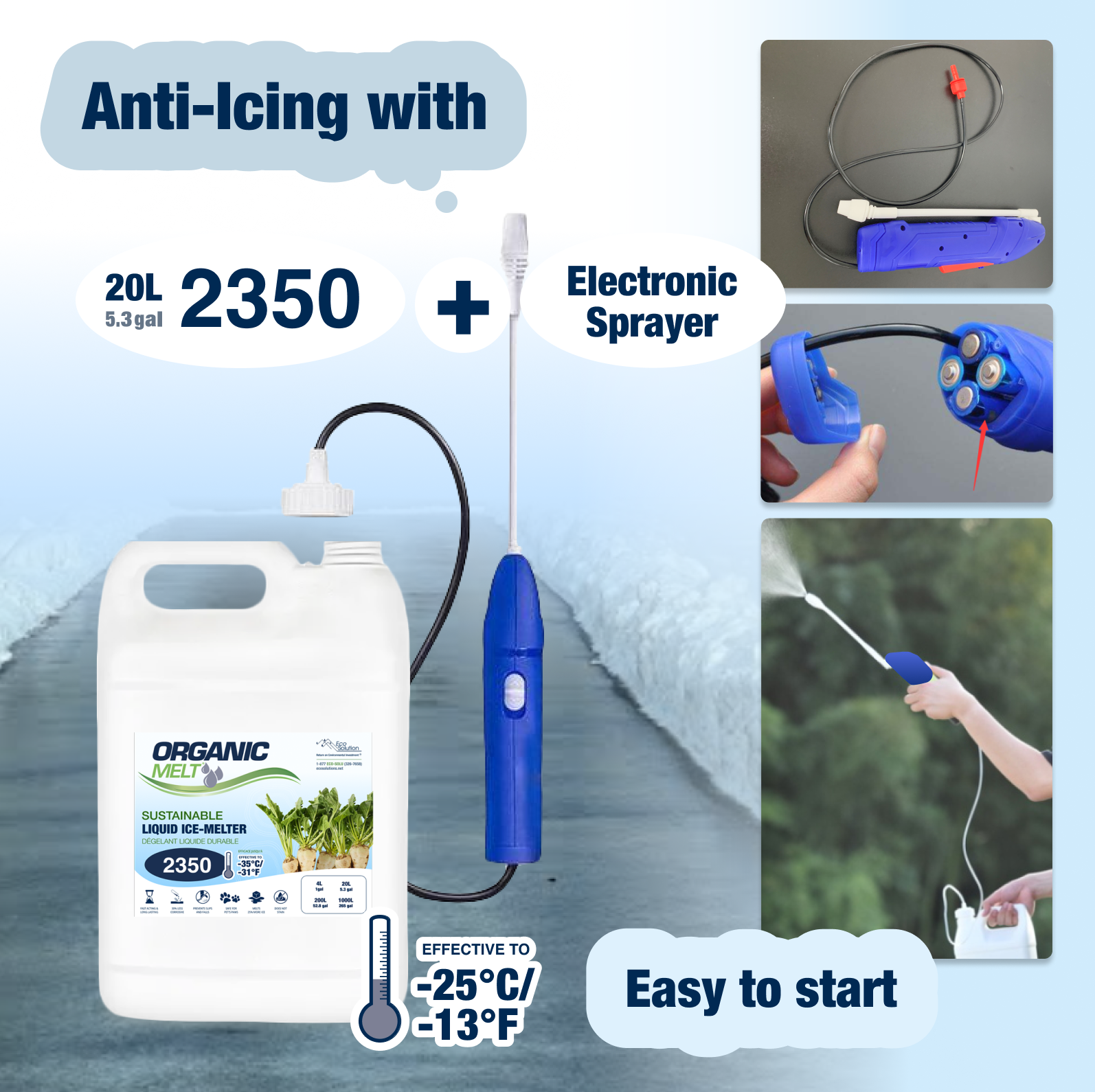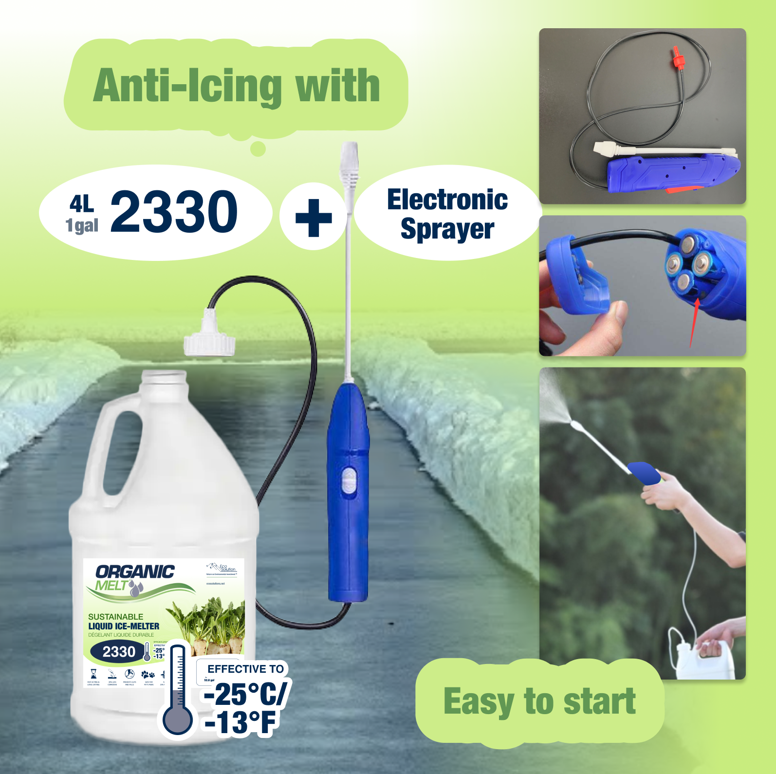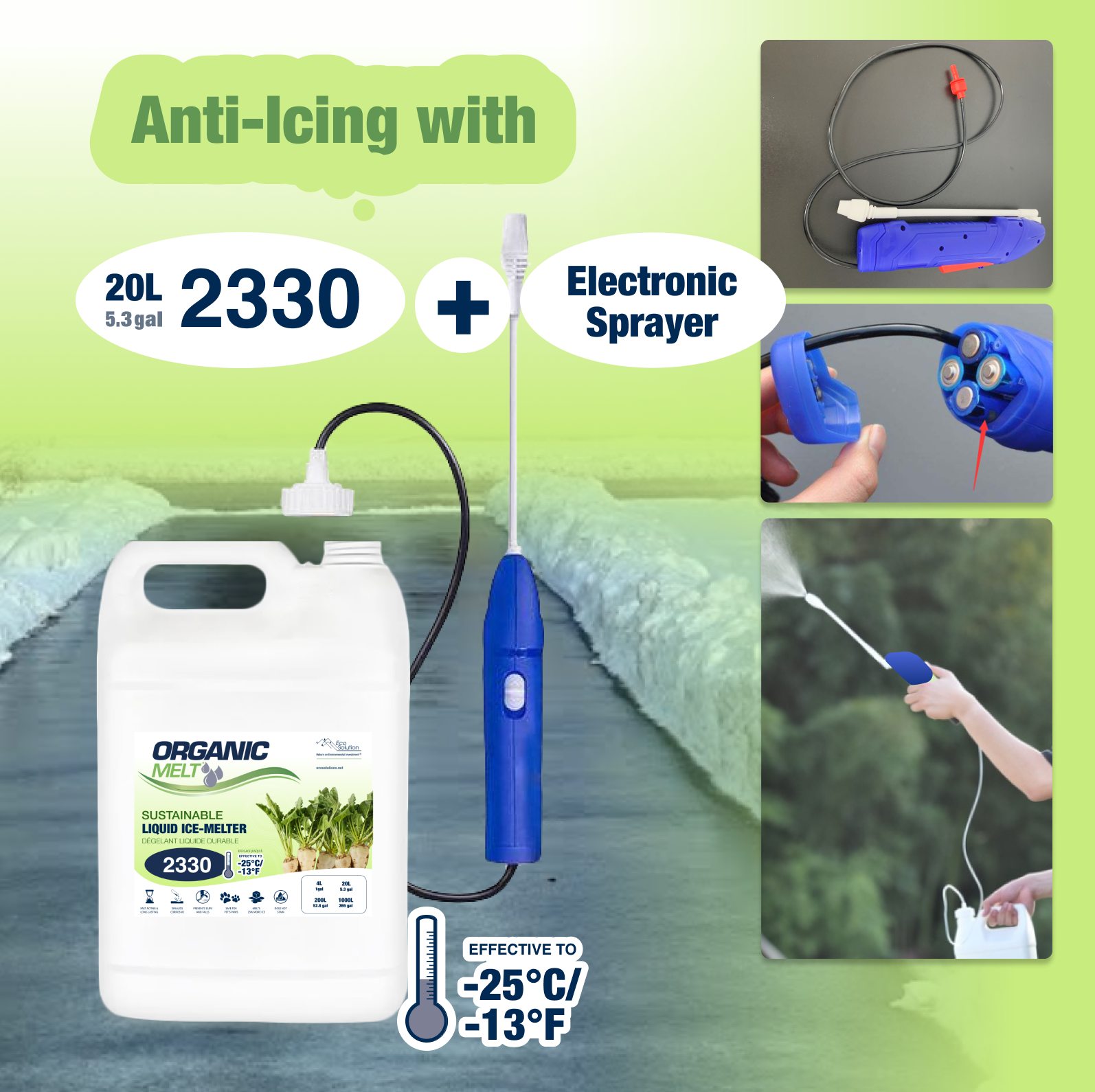 Get started with the Organic Melt – Liquid Starter Pack, the ultimate solution for convenient, eco-friendly de-icing. This starter pack includes a 4 L jug of Organic Melt 2330, paired with a screw on electric sprayer to make application easy and efficient. Perfect for homes, small businesses, or anyone looking to experience the power of Organic Melt’s sugar beet additive formula.